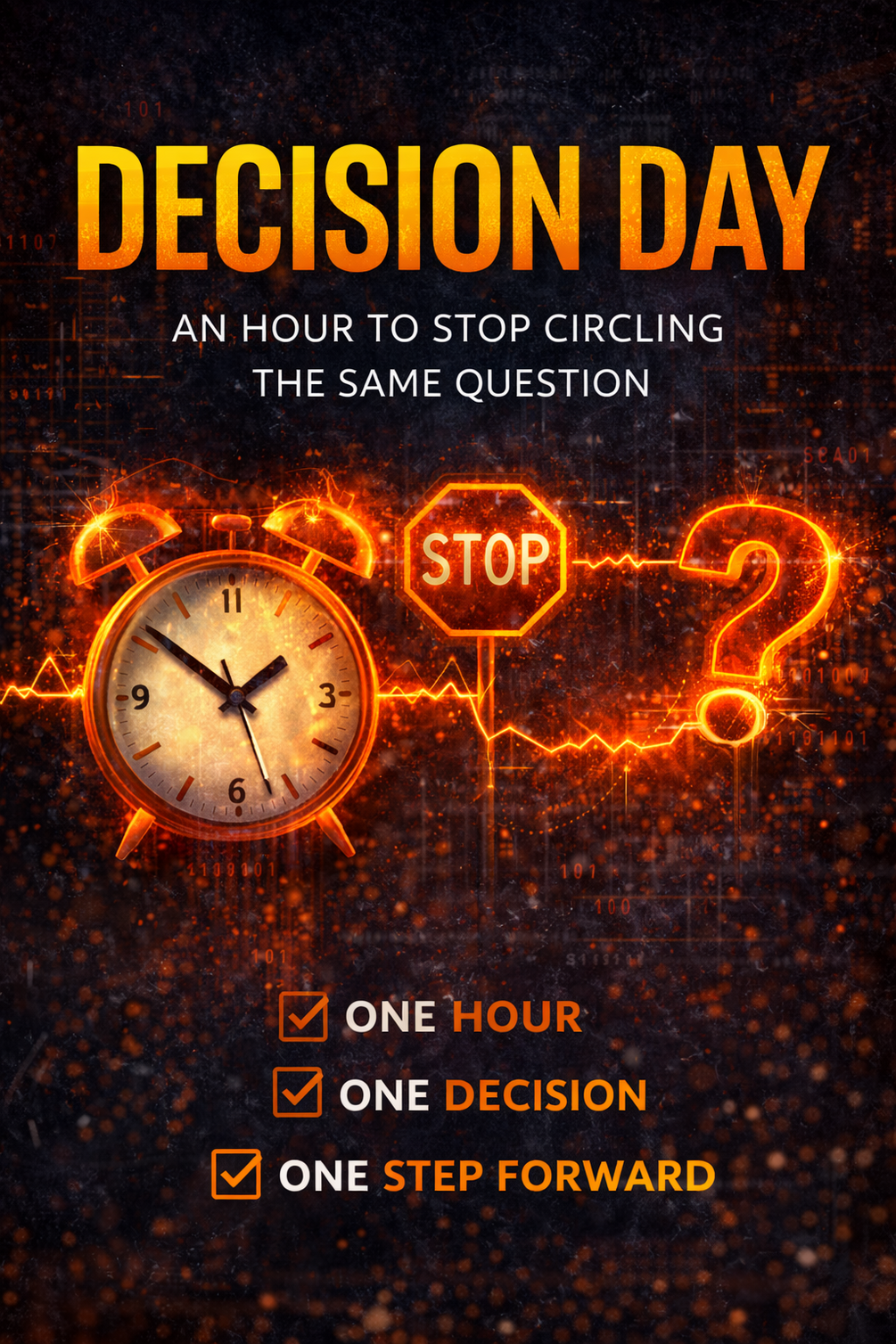 Decision Day is a one-hour method for people who are tired of rehearsing the same decision and want to move it forward — without drama, reinvention, or false confidence.